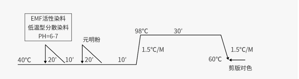 EMF系列活性染料是染料發(fā)展中的重大研發(fā)成果,實現(xiàn)了活性染料無堿染色的誕生。在中性染色條件下有較高的上染率表現(xiàn),降低了染料的水解速率,該系列染料染色同步性和配伍性好,在染色和加色中操作方便快捷,勻染性好不易產(chǎn)生色花,縮短了染色工藝時間,提高生產(chǎn)效率同時降低了染色綜合成本。適用于棉、麻等纖維素纖維等淺中色系列的染色,同時適用于分散/活性一浴法等混紡織物淺色系列的染色。